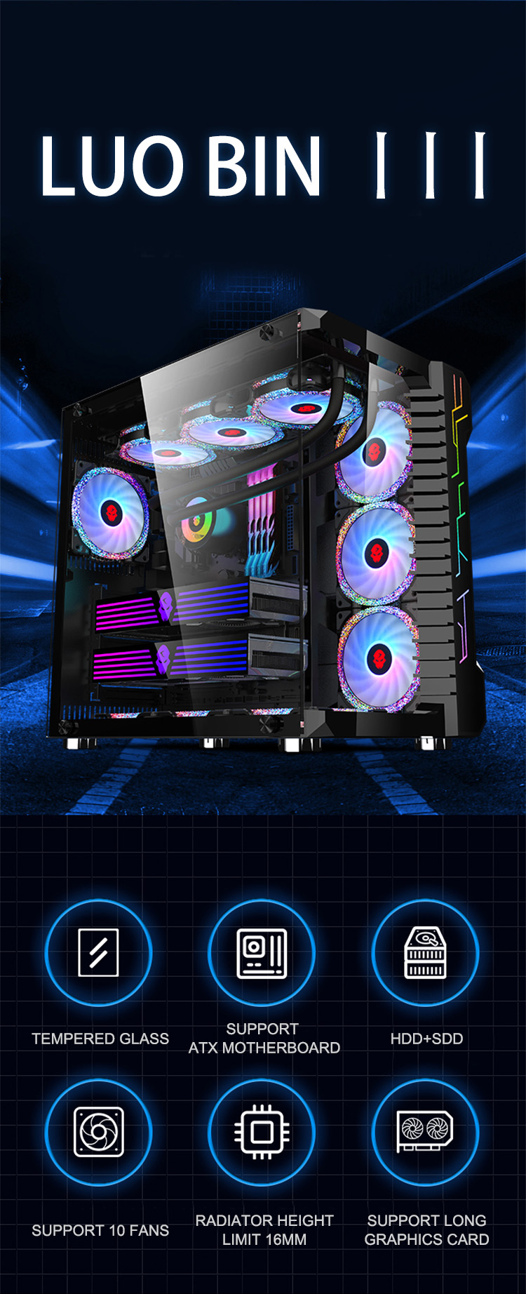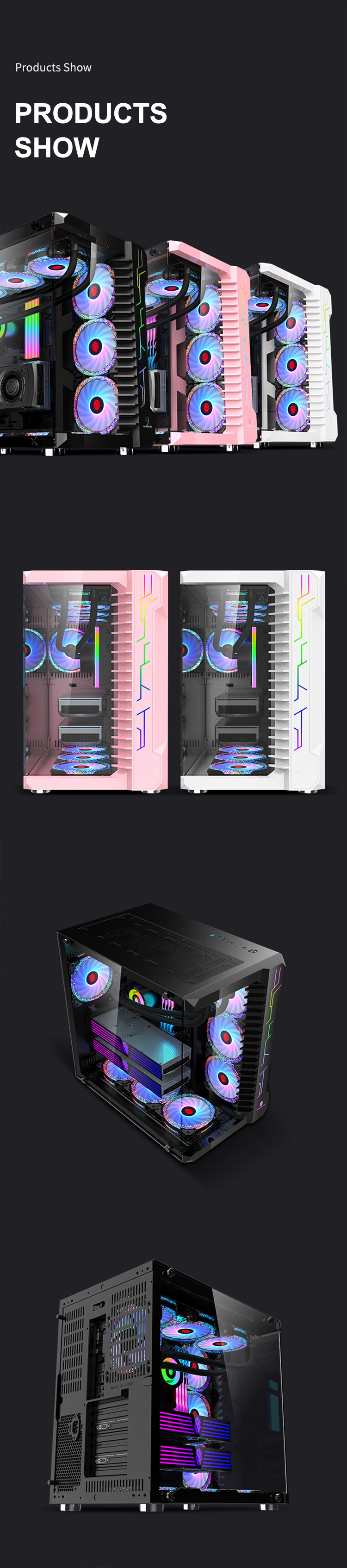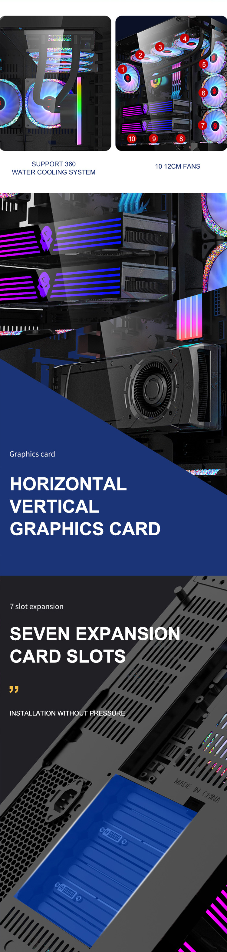 120MM fan on the front side of the chassis motherboard*3120MM fan at the bottom of the host compartment*3 Top 120MM fan*3/compatible with 360 water drain;120MM fan in the back host compartment*1;