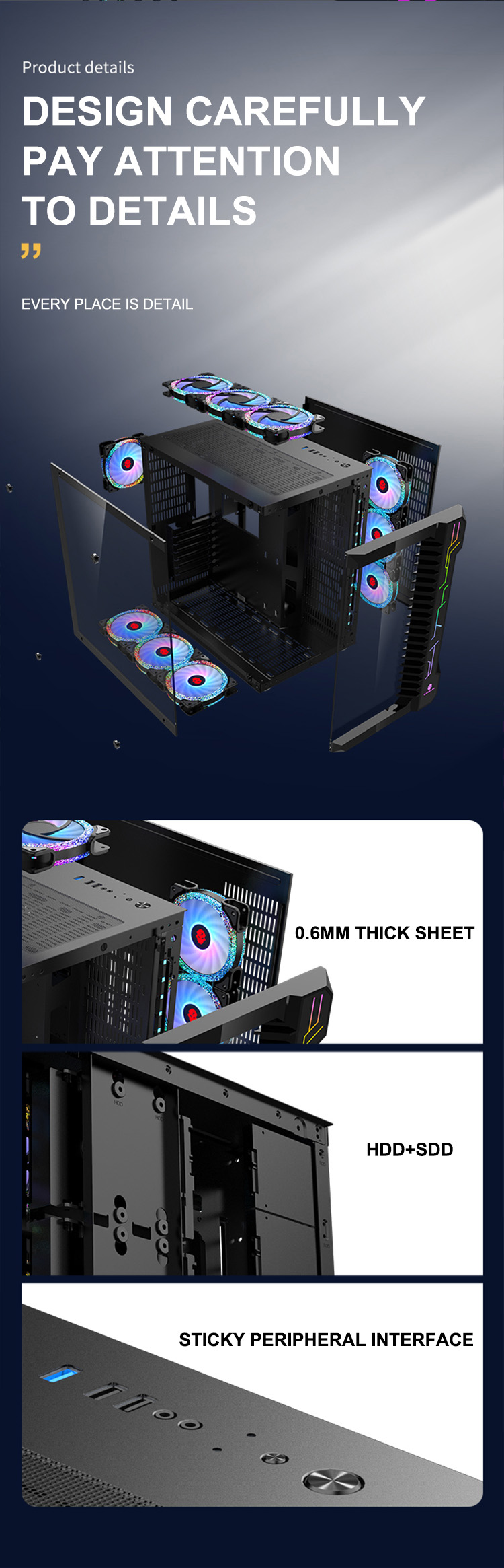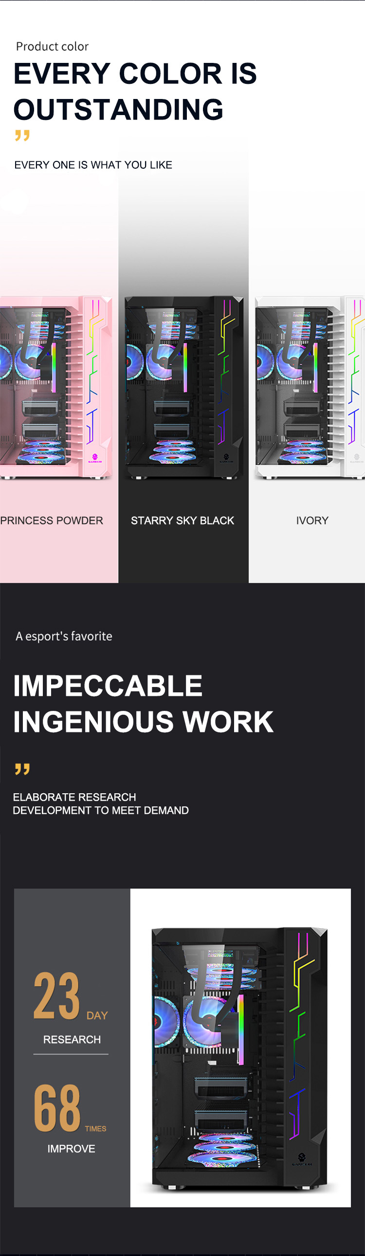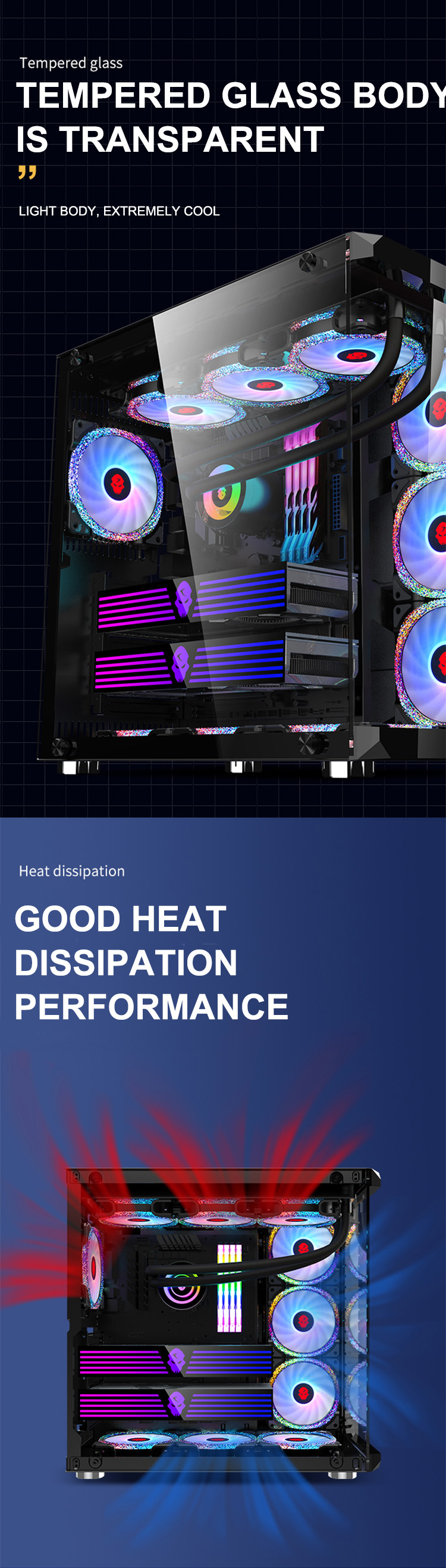 120MM fan on the front side of the chassis motherboard*3120MM fan at the bottom of the host compartment*3 Top 120MM fan*3/compatible with 360 water drain;120MM fan in the back host compartment*1;