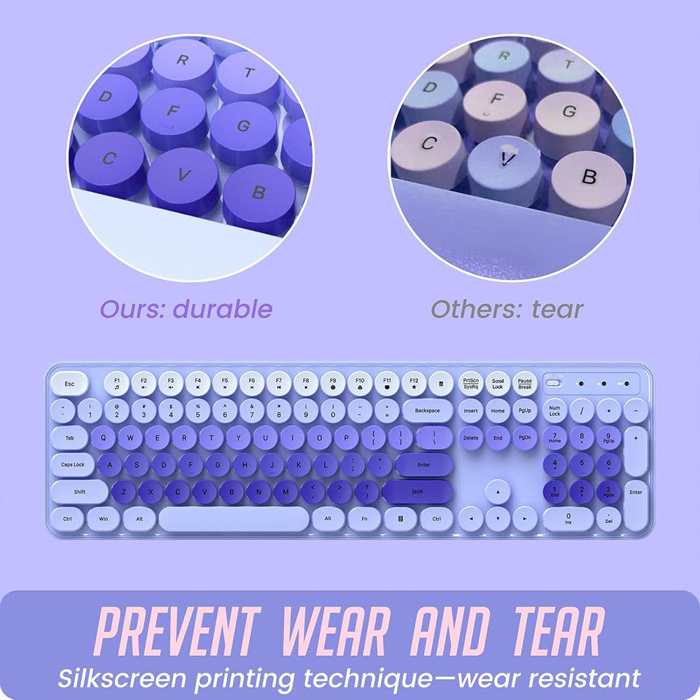 Cute round keycaps, crisp and sweet sound, perfect knocking feel, let you find the feeling of a retro typewriter. And it’s detachable, making the keyboard easy to clean.